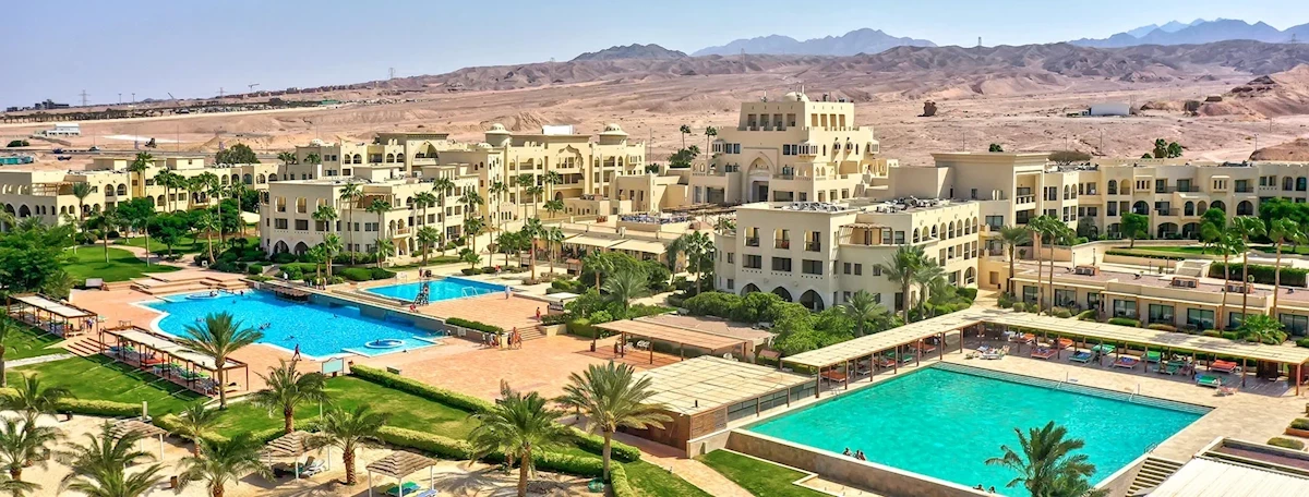 Lotnisko w Aqabie dzieli od obiektu ok. 25 km. Obiekt położony jest ok. 15 km od Aqaby, a do centrum można dostać się darmowym shuttle busem, który kursuje dwa razy dziennie. Wymagana jest wcześniejsza rezerwacja miejsca. W zasięgu ok. 2 godzin jazdy samochodem znajduje się Petra, a ok. 1 godziny - Wadi Rum. Kompleks hotelowy jest częścią resortu Tala Bay i otoczony jest zadbanym palmowym ogrodem. Obiekt zlokalizowany jest tuż przy plaży, co zapewnia widok na Zatokę Aqaba. Położony w zacisznej okolicy, w pobliżu znajduje się kilka sklepów, nadmorska promenada oraz marina.Program sportowy i animacyjny