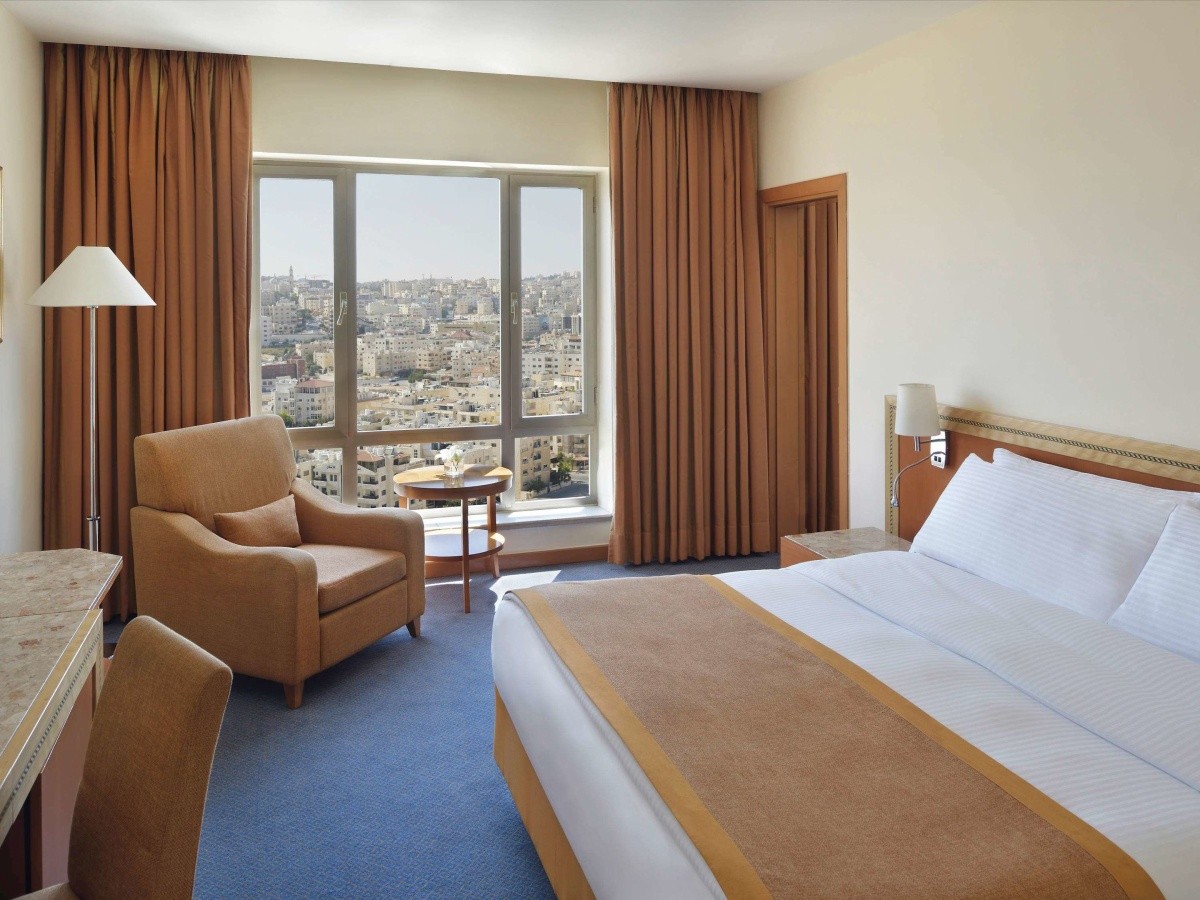 Lage & Umgebung Das Stadthotel liegt sehr günstig im westlichen Teil von Amman, ganz in der Nähe von Einkaufszentren. So ist es der perfekte Ausgangspunkt, um die zahlreichen Sehenswürdigkeiten Jordaniens zu erkunden, darunter sind etwa das Tote Meer (ca. 40 km entfernt) und der Berg Nebo. Nach etwa 30 min Fahrtzeit erreicht man den Flughafen Queen Alia International.