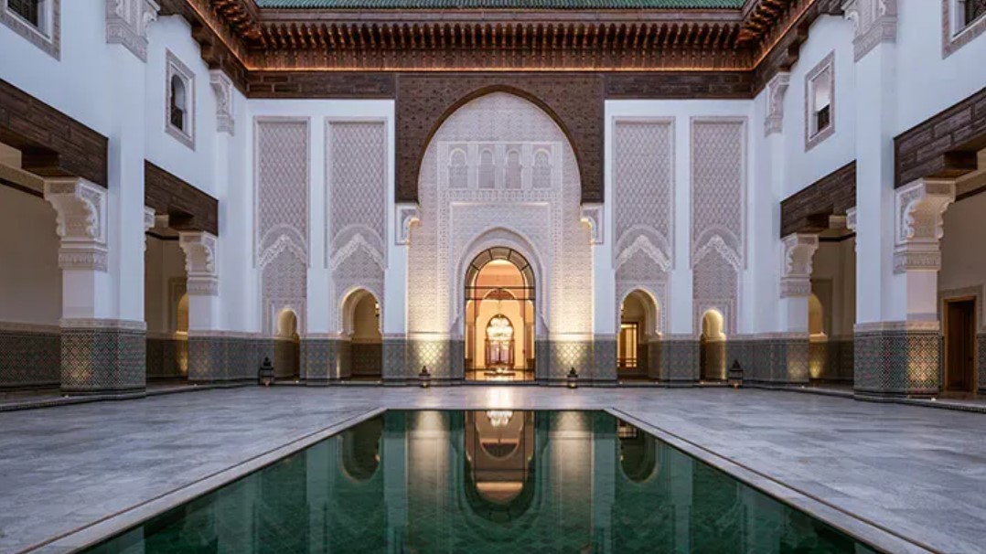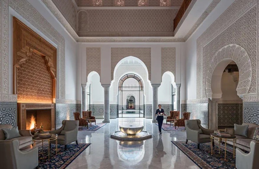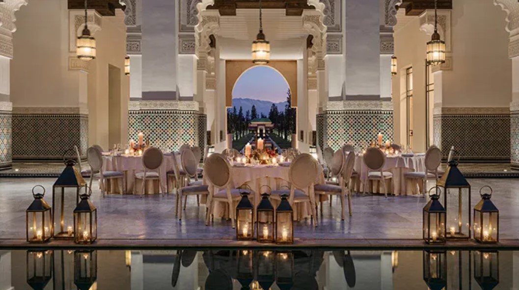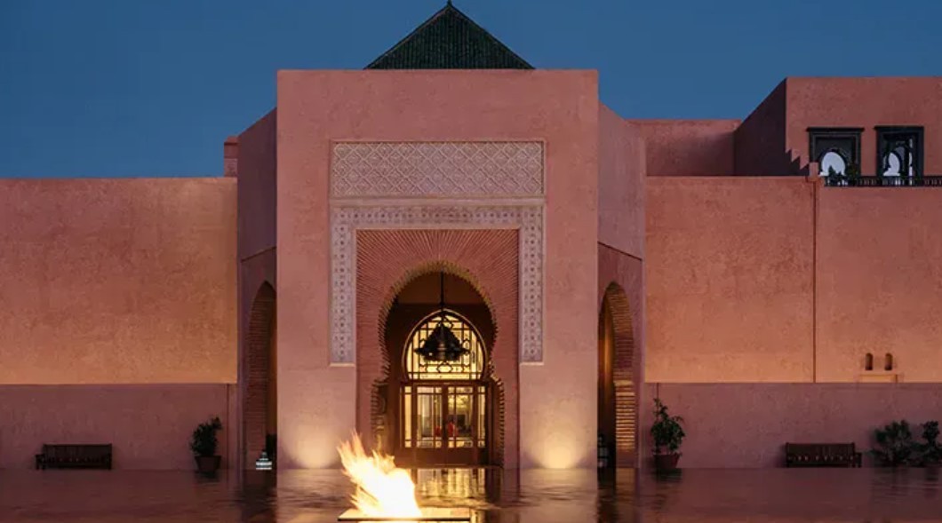 Das Hotel: Das Luxusresort liegt inmitten von 11 Hektar wunderschön gestalteten Gärten, duftenden Zitrusplantagen und Olivenhainen, mit spektakulärem Blick auf die schneebedeckten Gipfel des Atlasgebirges. Inspiriert von marokkanischer und andalusischer Tradition wurde das Resort im Stil eines Palastes des 14. Jahrhunderts erbaut. Außerdem orientieren sich einige Elemente an der berühmten ehemaligen Koranschule Medersa Ben Youssef, die dem Stil eine ganz besondere Note verleihen. Das Highlight des Hauptgebäudes ist der sonnendurchleuchtete Innenhof mit einem schwarzen Wasserbecken, welches die Illusion unendlicher Tiefe erzeugt. Mit 3 Restaurants, Bar, Terrasse mit imposanten Blick auf die Gärten und das Atlasgebirge, Swimmingpool (30 m) und beeindruckendem Wellness- & Spa-Bereich sowie Kids Club. Das Resort liegt 25 Autominuten vom berühmten Marktplatz Djema el-Fna und der alten Stadtmauer entfernt. Der Flughafen Marrakech ist ca. 17 km weit entfernt.