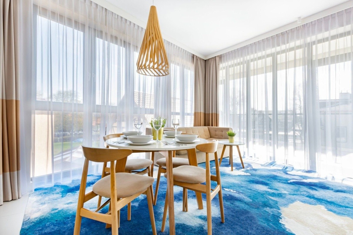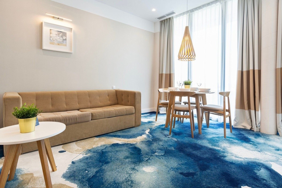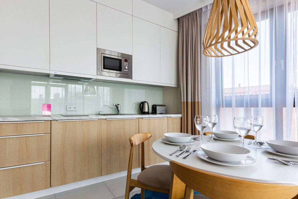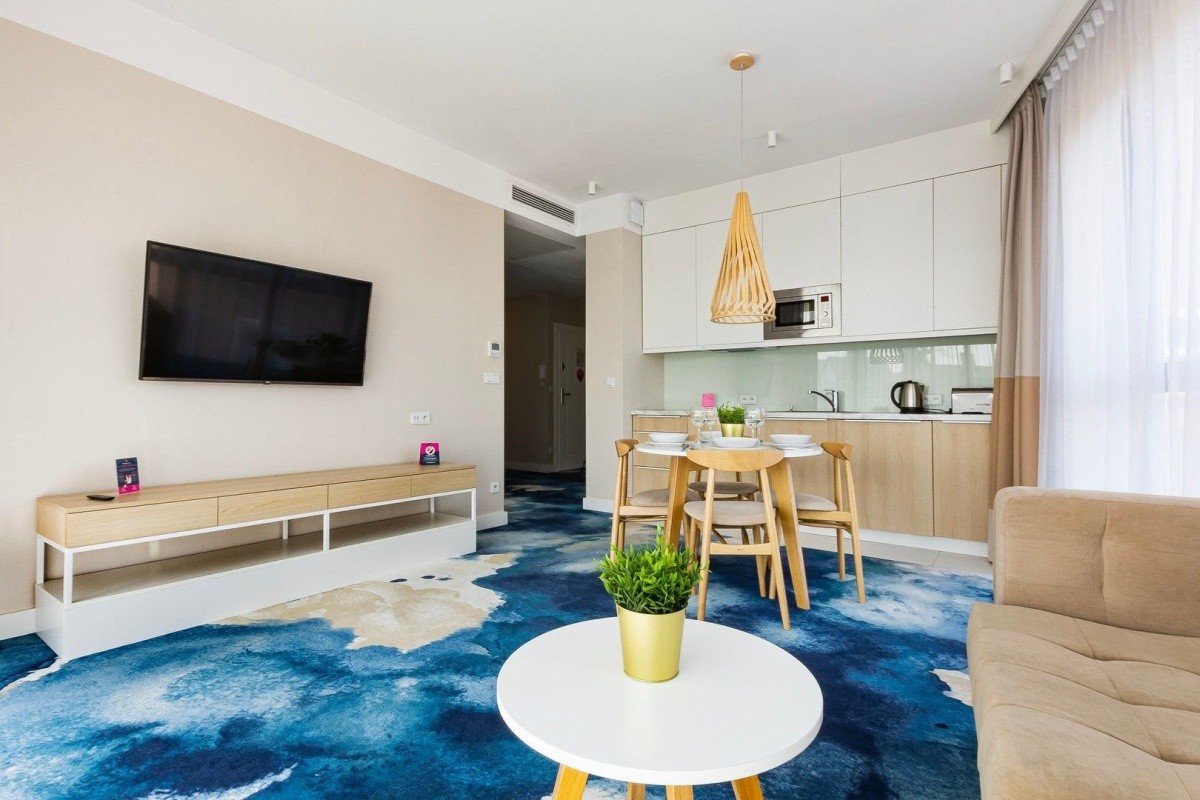 Moderní klimatizované apartmány s obývacím pokojem, plně vybaveným kuchyňským koutem, ložnicí a koupelnou se sprchou a toaletou.