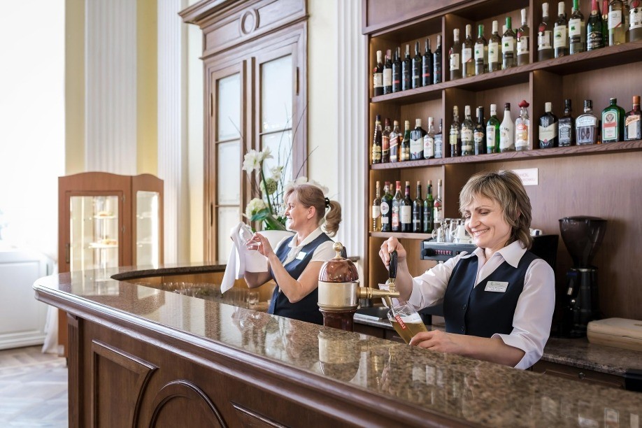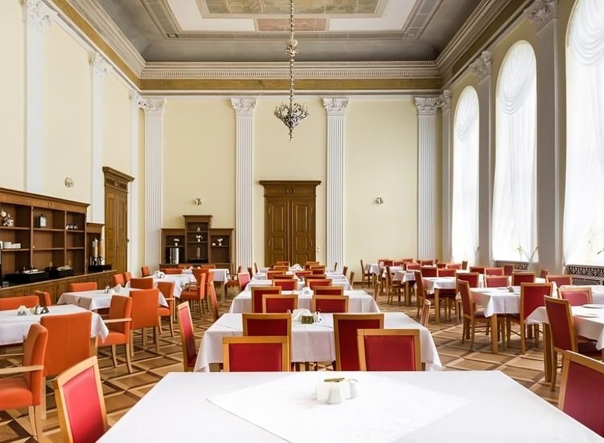Všechny pokrmy si hosté mohou vychutnat v krásné historické jídelně, která okouzlí svým půvabem a architektonickým pojetím. Snídaně a večeře jsou podávané formou bohatých švédských stolů, obědy jsou servírované. K dispozici je i speciální dietní strava. Od 12:00 do 15:00 hod. je podáván v den příjezdu oběd, večeře je od 17:00 hod. Z důvodu plynulého průběhu mohou být první den přiděleny přesné časy obědů a večeří. Pobyt začíná obědem a končí snídaní.