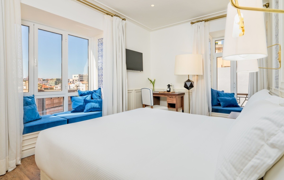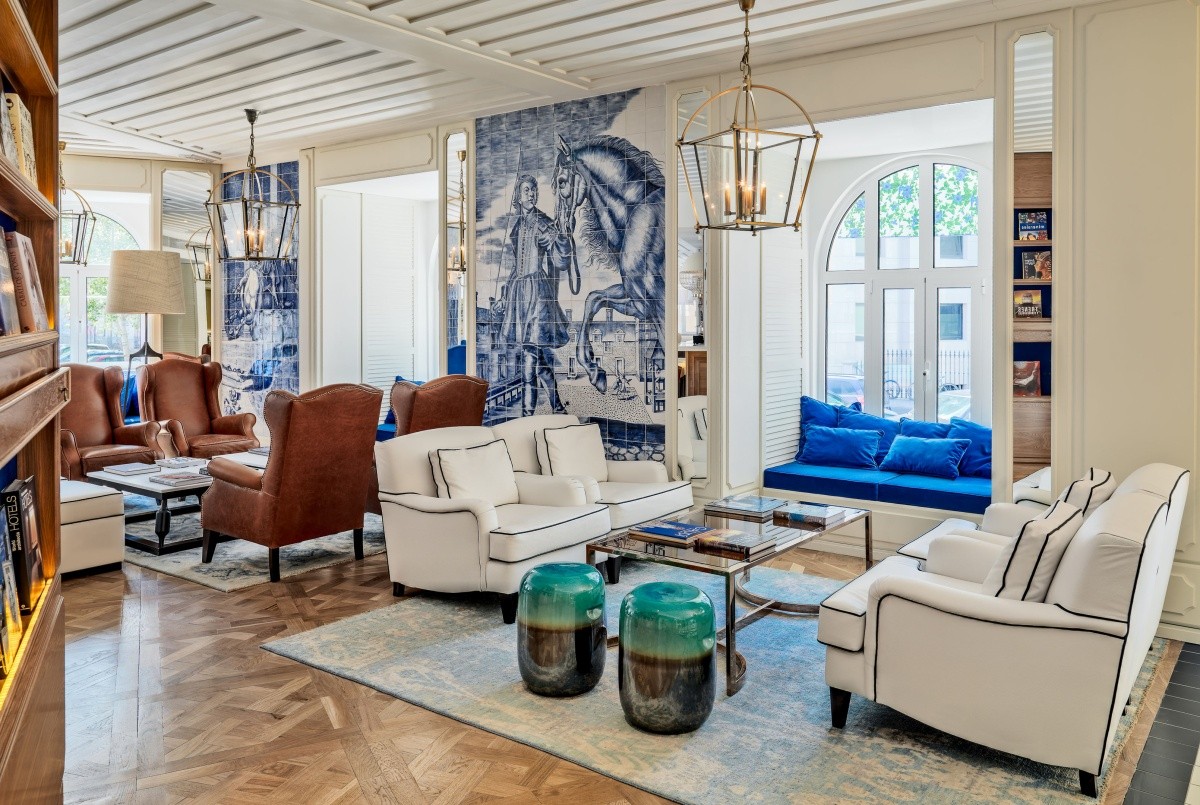 Interiérová výzdoba s tradičnými portugalskými prvkami, ako sú modré a biele azulejos