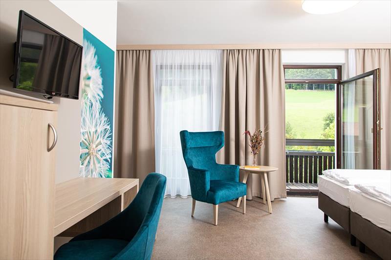 Velikost wellness zóny 370 m2, krytý bazén 45 m2, parní lázeň 1x - zdarma, sauna 1x - zdarma, finská sauna - zdarma, relaxační místnost, nudistická zóna, masáže - volitelné, platí se v resortu, zahrada, trávník, lehátko - zdarma