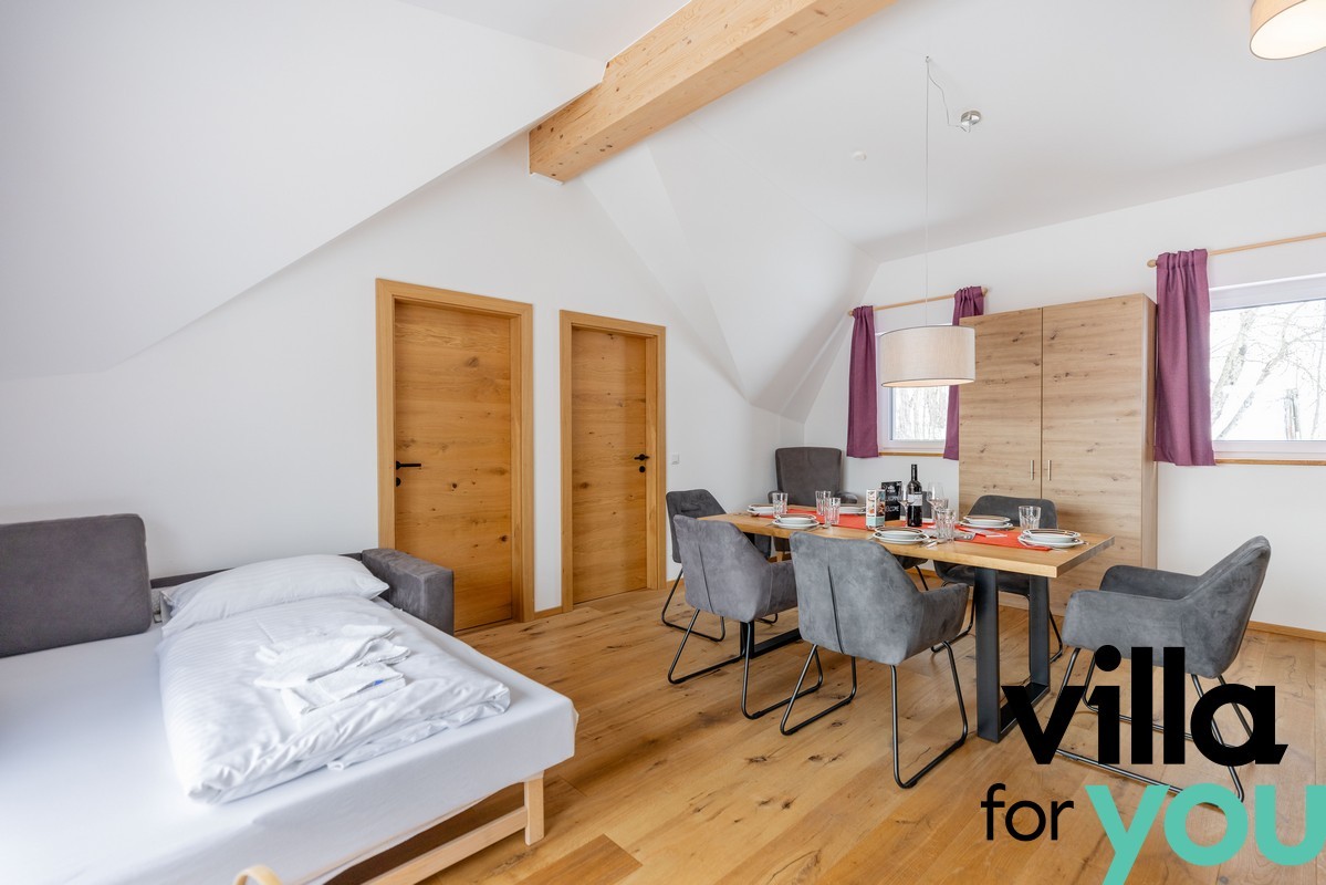 K dispozici krytý bazén a sauna (za poplatek). Apartmán pro 2-3 osoby: Obývací pokoj s rozkládací pohovkou, ložnice s manželskou postelí, vybavená kuchyň, koupelna se sprchou a WC. Apartmán pro 2-4 osoby: Obývací pokoj s rozkládací pohovkou pro dvě osoby, ložnice s manželskou postelí, vybavená kuchyň, koupelna se sprchou a WC. Apartmán pro 3-5 osob: Obývací pokoj s rozkládací pohovkou pro dvě osoby, vybavená kuchyň, ložnice s manželskou postelí a jednolůžkem, koupelna se sprchou a WC. Apartmán pro 4-6 osob: Obývací pokoj s rozkládací pohovkou pro dvě osoby, vybavená kuchyň, dvě ložnice s manželskou postelí, koupelna se sprchou a WC. Apartmán pro 5-7 osob: Obývací pokoj s rozkládací pohovkou pro dvě osoby, vybavená kuchyň, ložnice s manželskou postelí a rozkládací pohovkou pro dva, dvě ložnice s jednolůžkem, koupelna se sprchou a WC. Parkování: u objektu zdarma.