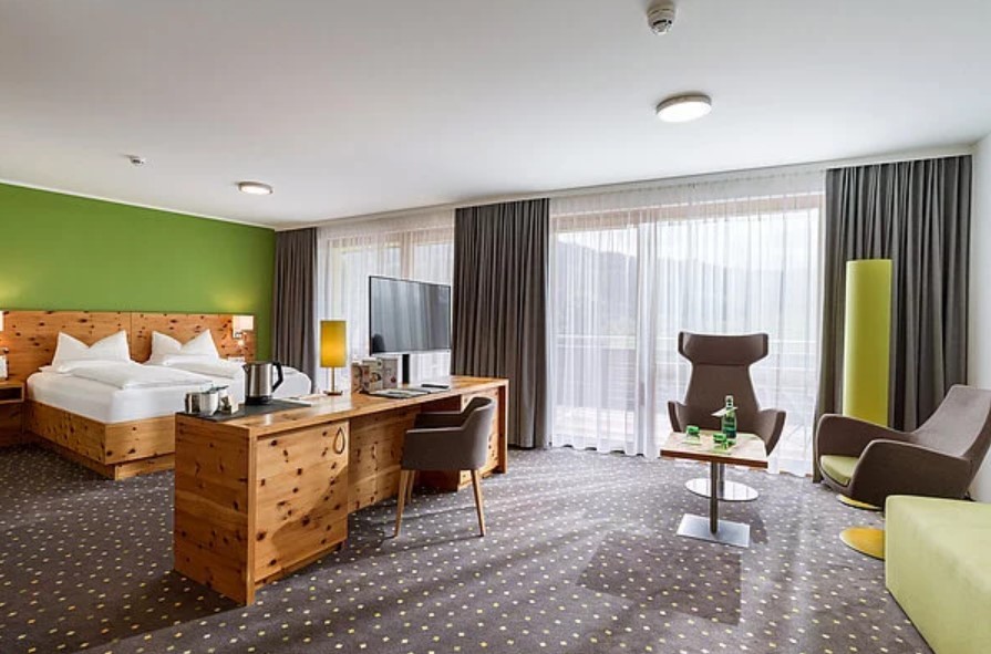 - 46-50 m2, junior suite, posteľná bielizeň, uteráky a matrace zo 100% organickej bavlny, kombinovaná obývacia/spálňová časť, priestor na posedenie, sprcha, župan, papuče, sušič vlasov, minibar za poplatok, trezor, TV (satelitná TV) , káva/čaj, balkón