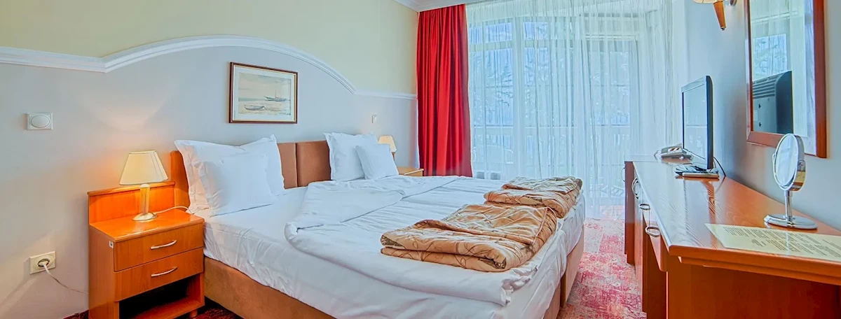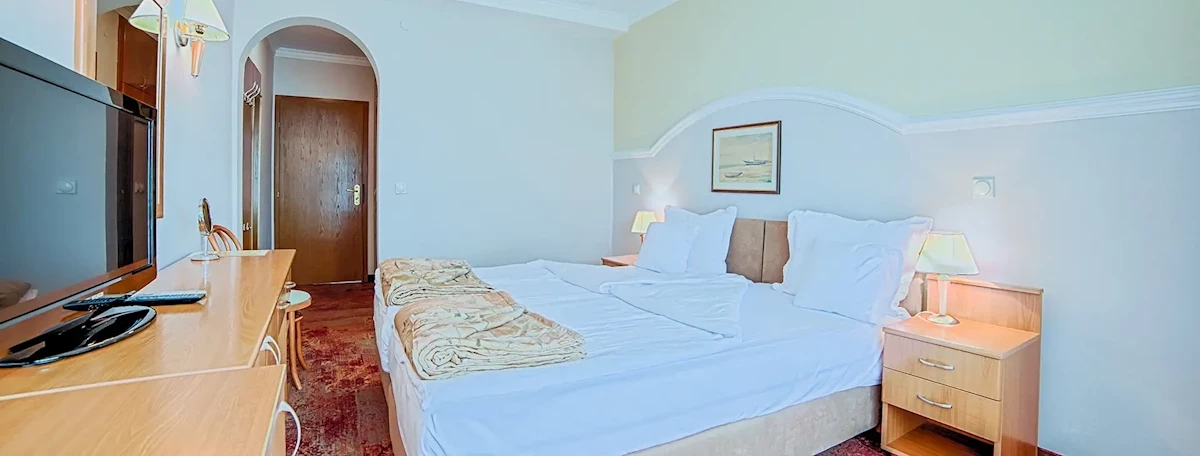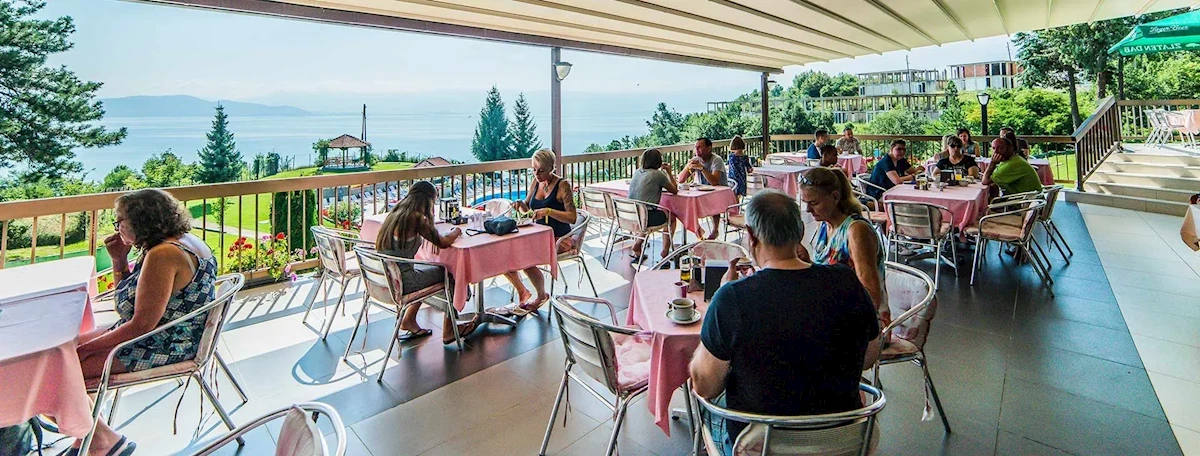 PokojeHotel posiada ponad 40 klimatyzowanych pokoi 2-os. z łazienką (WC, prysznic lub wanna; suszarka do włosów) oraz balkonem lub tarasem z widokiem na Jezioro Ochrydzkie. Możliwość dostawki dla dziecka (łóżeczko dla niemowlaka na zapytanie). W każdym pokoju: wykładzina, TV-sat, telefon i mini bar (za dodatkową opłatą).