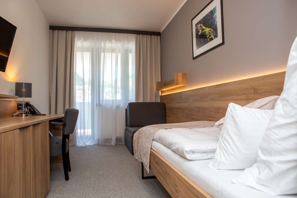 Tento hotel vytváří bránu do pěší zóny jednich z nejstarších lázní na Slovensku a nabízí širokou škálu služeb pod jednou střechou. Nabízí ubytování v nových, moderních pokojích a díky své poloze u lázeňského parku vytváří příjemnou atmosféru pro odpočinkový pobyt. Nechybí ani moderní, stylová restaurace v přízemí, s bohatou nabídkou gastronomických zážitků, ke které náleží i příjemná kavárna „Slovakia“ s terasou a výhledem přímo na lázeňské náměstí. Hotel dále disponuje nově vybudovaným wellness-medicínským centrem WellMed s moderním bazénem a saunovým světem. Pro všechny milovníky wellness je připraven relaxační bazén, parní a suché sauny, tematické odpočívárny, tepidarium, zážitkové sprchy, Kneippův chodník a spousta druhů masáží, například klasické, reflexní, nebo lymfodrenážní. Hotel se v rámci lázní zaměřuje na léčbu pohybového aparátu. Dopřejte si víc než wellness a okuste zdejší speciální lázeňské procedury. Díky termální vodě je léčba velmi efektivní a probíhá v rámci speciálních procedur. Provádí se zde například koupele v termálních bazénech a speciálních vanách, tzv. „balneoterapie“ – různé druhy zábalů (parafínový, rašelinový) s použitím přírodních léčivých prostředků a v neposlední řadě léčivá pitná kúra, elektroléčba, nebo léčebná rehabilitace. V hotelu se dále nachází sluneční terasa, kongresový sál, počítačový koutek, herna s biliardem, společenskými hrami a knihovnou, dětský koutek. Na recepci je možné objednat si praní prádla (za poplatek), hotel je propojený chodbou s lázeňským komplexem Krym a všechna jeho patra jsou přístupné výtahem.