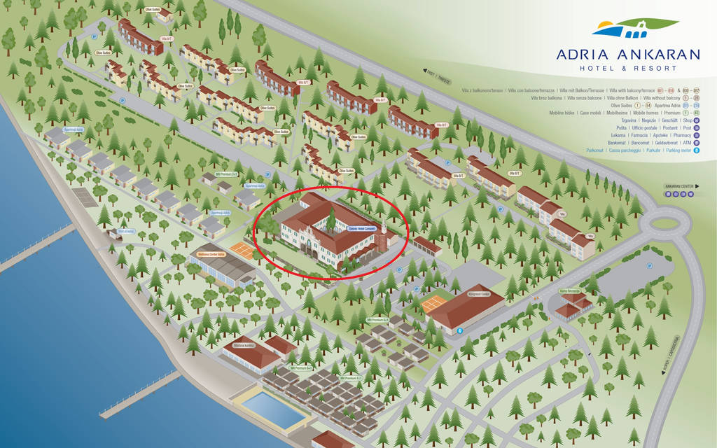 Nejsevernější přímořské letovisko Slovinska Ankaran leží asi 10 km severně od slovinského Koperu a necelých 5 km od italského města Muggia u Terstu. Rozkládá se na poloostrově Milje, přímo u moře, ve stínu borovice a olivovníků. Hotel je součástí turistického středisko Adria Ankaran, které má vlastní 1 km dlouhou pláž (částečně betonová, travnatá i oblázková) s mělkým mořem vhodným pro děti. Okolí nabízí procházky po pobřeží, turistické stezky i cyklostezky. Nedaleko se nachází přírodní rezervace Debeli rtič. Hotel se nachází v budově bývalého benediktinského kláštera, který prošel v roce 2020 rekonstrukcí.