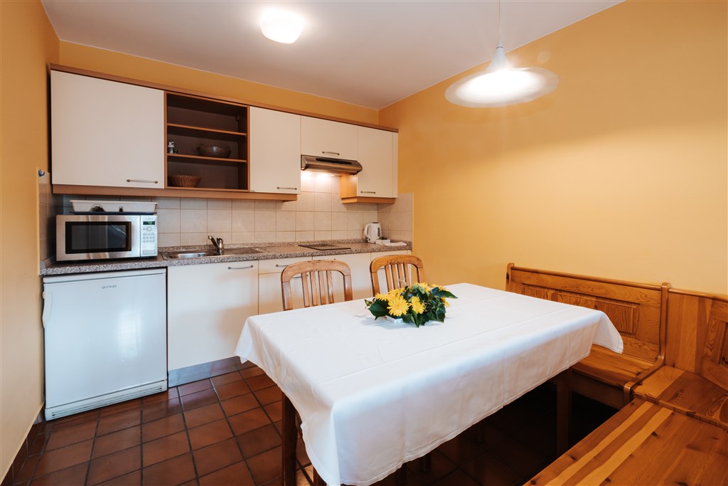 Apartmán A (2 osoby): Ložnice s manželskou postelí, kuchyňský kout, koupelna, SAT/TV, telefon, vytápění. Apartmán B (3 osoby): Ložnice s manželskou postelí a pohovkou, kuchyňský kout, koupelna, SAT/TV, telefon, vytápění. Apartmán C (4 osoby): Ložnice s manželskou postelí a palandou, kuchyňský kout, koupelna, SAT/TV, telefon, vytápění. Apartmán D (4 osoby): Ložnice s manželskou postelí, obývací pokoj s dvěma pohovkami, kuchyňský kout, koupelna, SAT/TV, telefon, vytápění. Apartmán D1 (4 osoby): Ložnice s manželskou postelí, obývací pokoj s dvěma pohovkami, kuchyňský kout, koupelna, SAT/TV, telefon, vytápění, balkon. Apartmán E (5 osob): Ložnice s manželskou postelí a jednolůžkem, obývací pokoj s dvěma pohovkami, kuchyňský kout, koupelna, SAT/TV, telefon, vytápění.