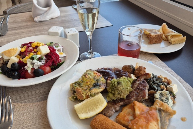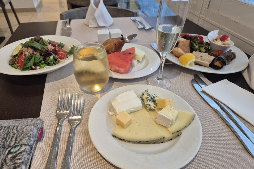 Celkově vzato je to v pořádku, je toho dost, i když chybí čerstvá zelenina. K snídani vynechali 7-up, sangrii a víno. K večeři nebylo k dispozici příslušenství pro přípravu čaje. V podstatě je jídlo stvořené pro Brity, kteří si naplní talíře a snědí všechno. U večeře je plno lidí a sotva se dá najít místo k sezení.