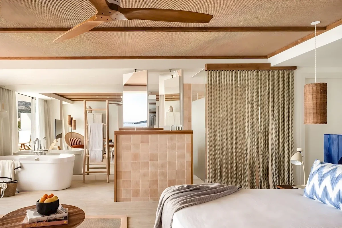 - otwarta łazienka (wanna i prysznic, wc, suszarka, zestaw kosmetyków, szlafroki i kapcie)