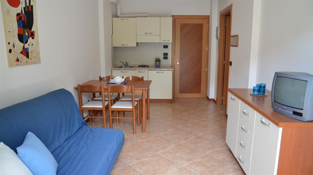 Family suite Standard 3(+2) - obývací část s rozkládací pohovkou, ložnice s manželskou postelí a jednolůžkem, kuchyňský kout, koupelna.