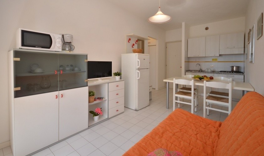 BILO 5 - pro 3-5 osob složený z: obývací pokoj s rozkládacím dvoulůžkem, 1 ložnice s 1 manželským lůžkem a 1 samostatným lůžkem, kuchyňský kout, koupelna, krytý balkón