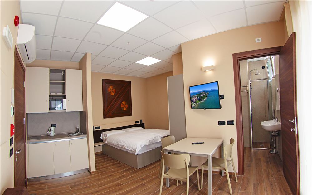 MONO 2+1 - jednopokojový apartmán Standard - min. 2 osoby, max. 3 osoby - vlastní sociální zařízení - vana/sprcha, balkon, boční výhled na jezero, kuchyňský kout, klimatizace zdarma, satelitní TV, lednice, trezor zdarma, Wi-Fi v ceně, stoly/židle venku