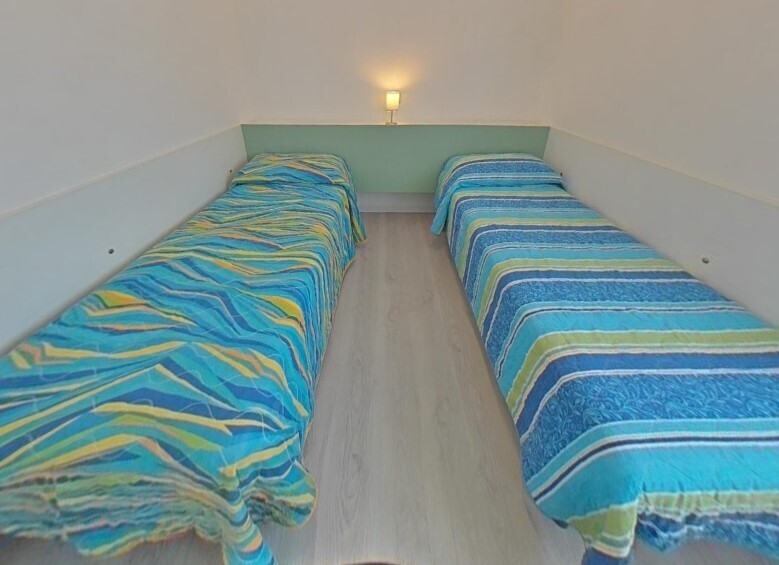 ložnice s manželskou postelí, ložnice se dvěma lůžky, obývací pokoj s gaučem a kuchyňským koutem