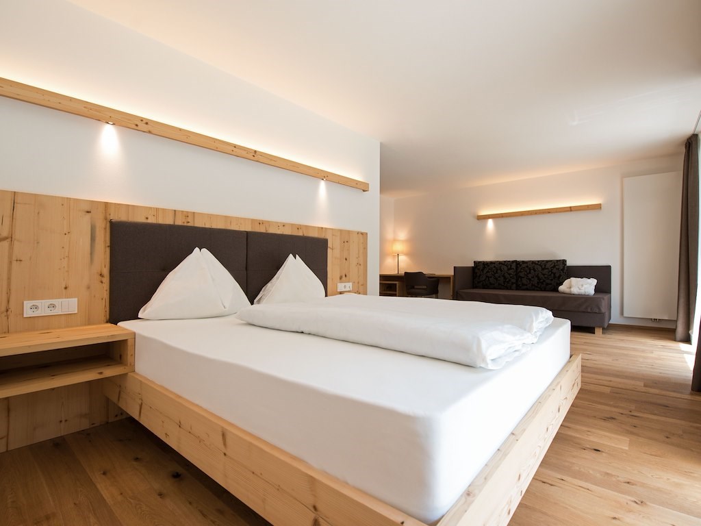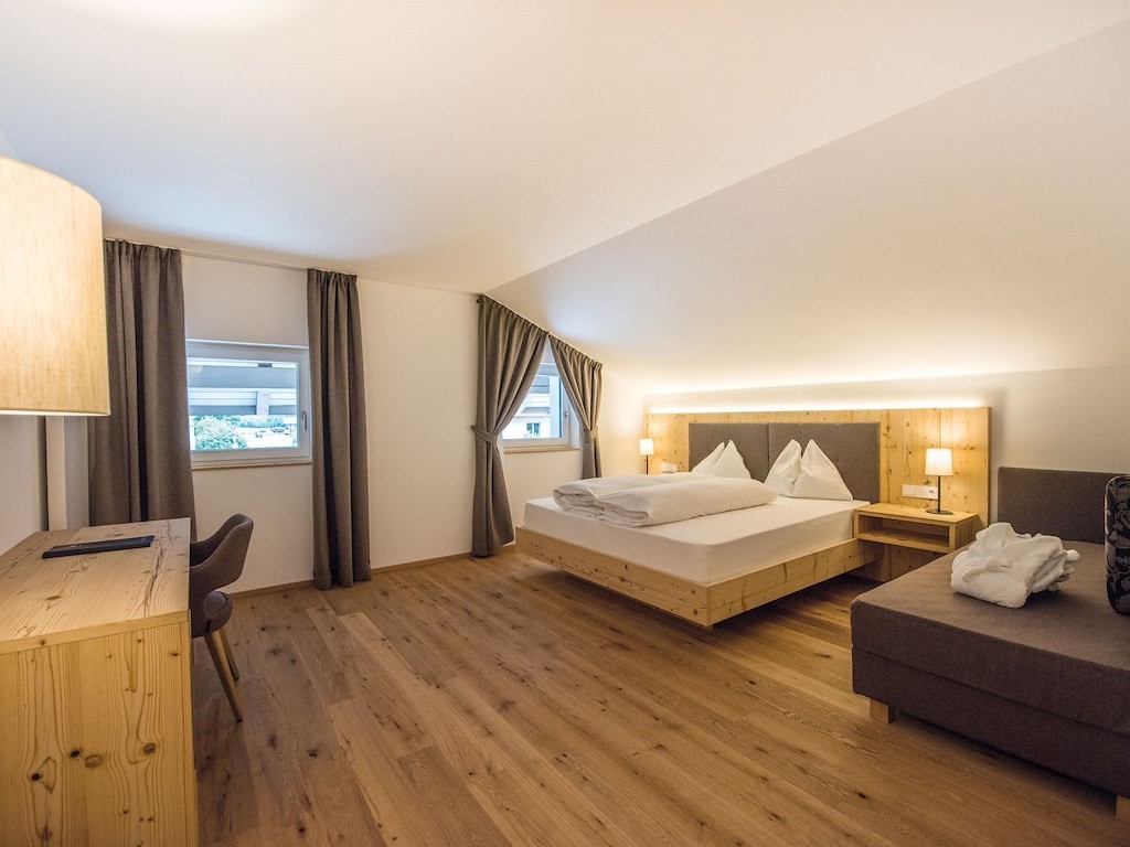 - Dvoulůžkové pokoje Dahoame Luchta: 30-37 m², renovované, v moderním rustikálním stylu s dřevěnými podlahami, orientace na jih a výhled na Luttach a okolní hory, navíc posezení, psací stůl a možnost 1 přistýlky formou rozkládací pohovky. Balkon je k dispozici na vyžádání a dle dostupnosti.