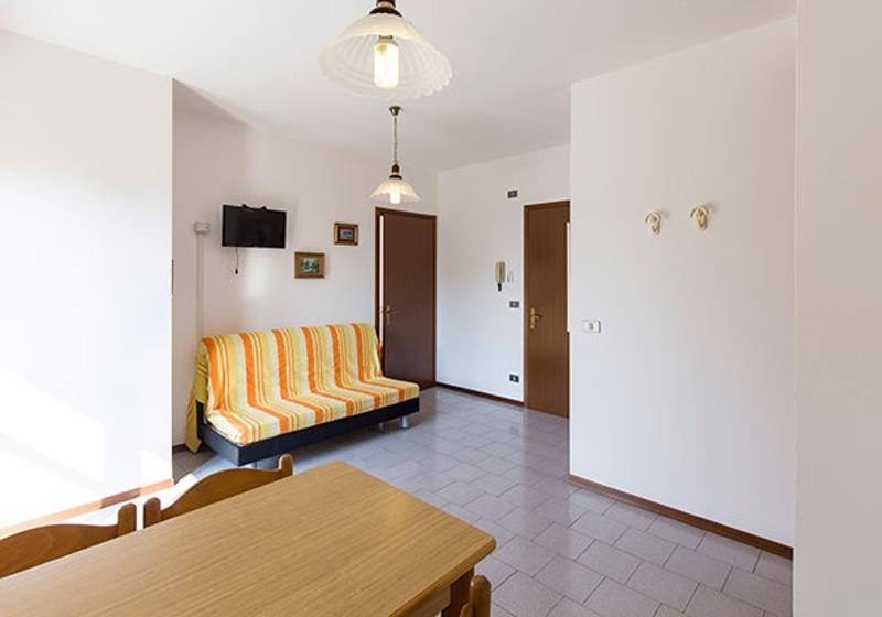 studio (jedna místnost) s rozkládacím dvojlůžkem a jedním lůžkem (rozkládacím), kuchyňský kout.