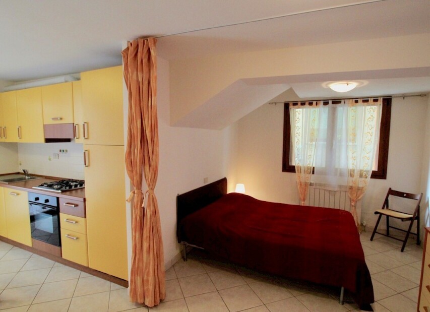 apartmán 7 mono 4:obývací pokoj s rozkládacím dvougaučem a kuchyňským koutem, nika s manželskou postelí