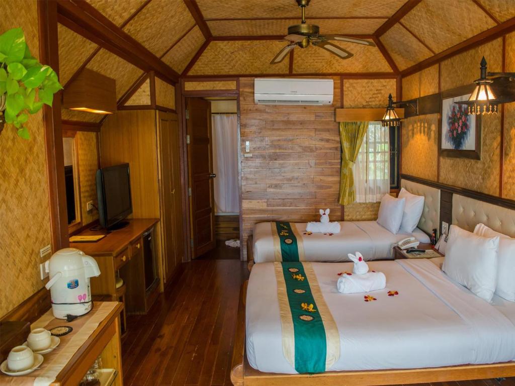 Ubytování: Klimatizace, koupelna s WC, fén, minibar, WiFi připojení (za poplatek), televize, větrák, varná konvice a trezor.
