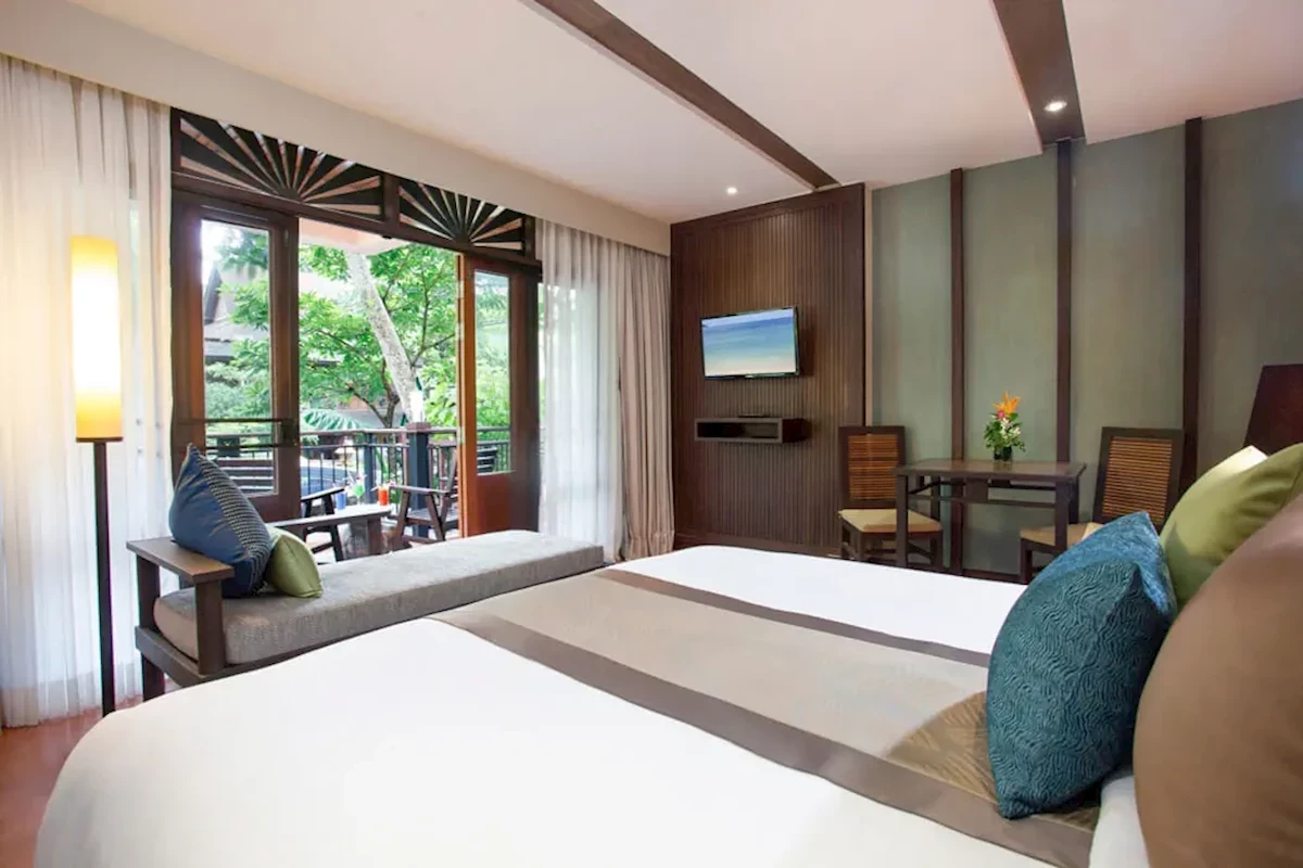 Dla max. 3 osób, Przestrzeń zewnętrzna: Balkon, Kanały telewizji: Angielski, Telefon w pokoju, wanna i prysznic , Powierzchnia pokoju: ok. 37 m2, Dostawka: łóżko rozkładane, Rodzaj podłogi: płytki, Sprzątanie codziennie, 1 sypialnia, Drzwi łączące między pokojami, Drzwi przesuwne, Maksymalna liczba osób dorosłych: 3, Maksymalna liczba dzieci: 2, Widok na ogród,Widok na basen, Liczba łazienek: 1, Liczba toalet: 1, Zestaw do parzenia kawy i herbaty, Klimatyzacja: Klimatyzacja indywidualnaDeluxe