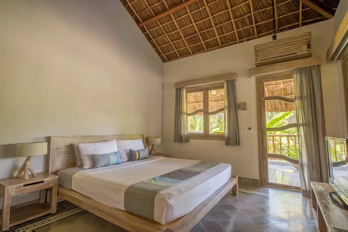 Dla max. 3 osób, Przestrzeń zewnętrzna: Balkon, Kanały telewizji: Angielski, prysznic, Powierzchnia pokoju: ok. 47 m2, Dostawka: łóżko rozkładane, Rodzaj podłogi: płytki, Sprzątanie cykliczne, 1 sypialnia, Maksymalna liczba osób dorosłych: 3, Maksymalna liczba dzieci: 2, Widok na ogród, Liczba łazienek: 1, Liczba toalet: 1, Zestaw do parzenia kawy i herbaty, Klimatyzacja: Klimatyzacja centralnaDELUXE BEACHFRONT BUNGALOW