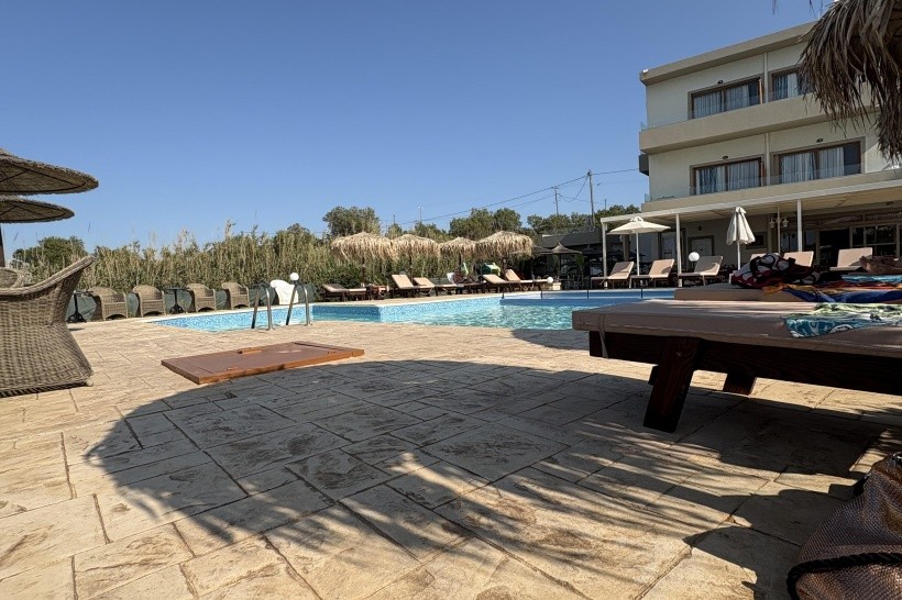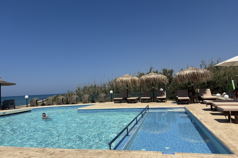 Hotel Golden bay je slušný, je možné ho objednat, ale trvejte na pokoji s výhledem na moře, protože většina pokojů tento boční výhled má. My jsme měli apartmán, což zahrnuje dva pokoje se samostatnými kuchyňkami a samostatnou koupelničkou se záchodem a samostatný balkon - vše spojeno malou chodbičkou. Klimatizace funguje a je v ceně zájezdu. Hotel se nachází téměř na pláži, je oddělen jen místní komunikací s malým provozem. Výhodné je to, že můžete bez problémů střídat bazén a koupání v moři. Slunečníky a lehátka patřící k hotelu jsou za poplatek 3,50 EUR, zatímco ostatní provozovatelé požadují zaplatit 5,00 EUR - na druhou stranu je v ceně nějaké pití dle vašeho výběru.