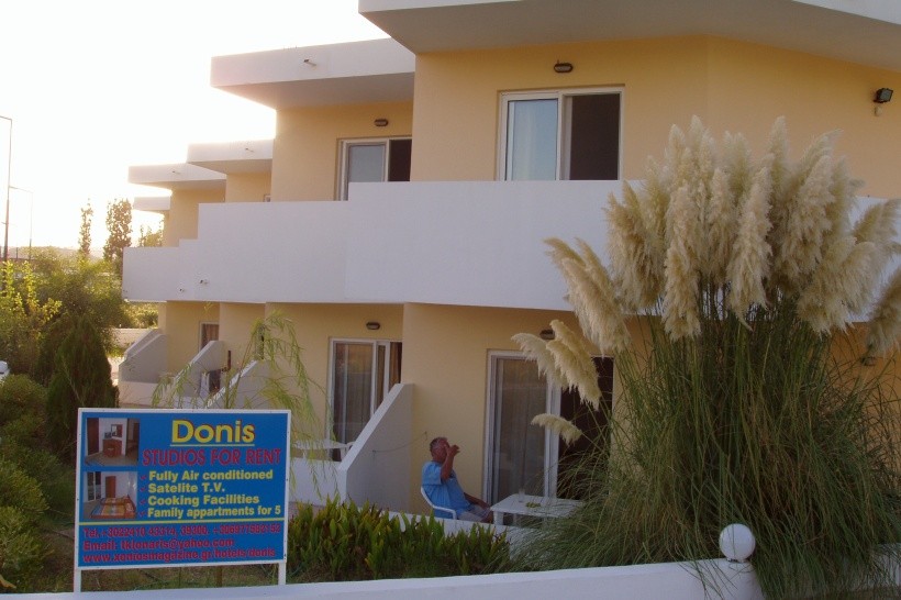 Pláž od DONIS st.50 m, krásná písčitá, pozvolně do moře,s lehátky a sluneč.za 7 EUR denně. V okolí nádherná Ladiko-nejlepší pro malé děti-úplně klidné moře a mělko. Možnost šnorchlování na Anthony Quin, krásné lázně Kallithea-i koupání. Všude autobusem.