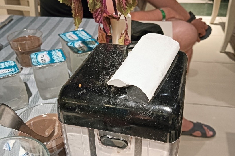 Jídlo bylo dobré, nikdo neonemocněl. Každý den něco jiného, s neustálým výběrem salátů a studeného bufetu a sladkosti byly také stejné, s drobnými obměnami. Teplá jídla byla ale každý den jiná; nebyly tam žádné speciální pochoutky jako mořské plody atd. Ale jedli jsme dobré, základní jídlo, včetně místní musaky a obyčejných hranolků. Takže si každý najde něco, co mu chutná, něco, co mu bude chutnat, ale nečekejte zde žádné výjimečné kulinářské zážitky; to bych v tom druhém hotelu hledal.
