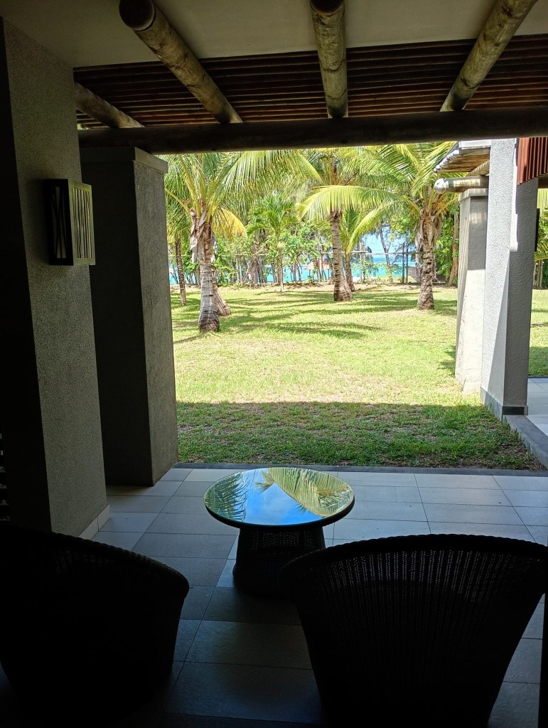 Velký, čistý pokoj s výhledem do zahrady (a za ní až k moři), vedle vyhřívaného bazénu. Díky umístění v přízemí jsme se chodili koupat rovnou z terasy.